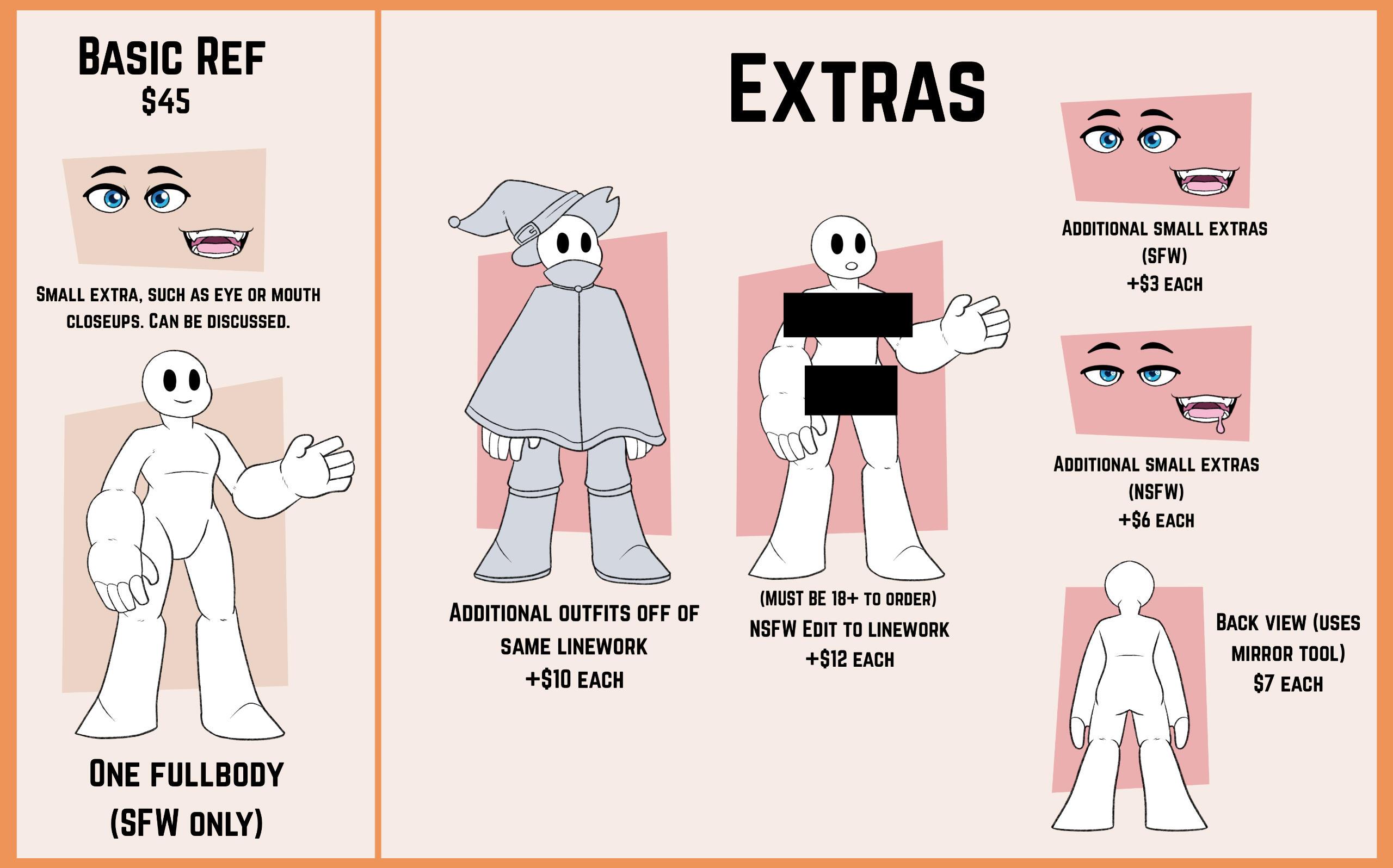 AS OF JUNE 27TH, PARTS OF MY TOS HAVE CHANGED, MAINLY RELATED TO REVISIONS. PLEASE LOOK IT OVER!I accept payment through paypal, venmo, cashapp, or kofi. It's done through invoices (unless it's through kofi).Payment is either up front or after the sketch is approved. I will discuss this with you to work out what is best. Payment will always be upfront for comms that are just sketches or if a comm is a YCH or base edit.Any work that includes anything NSFW will have +25% of the total cost added to it, unless agreed upon or mentioned. You must be 18+ to order this.Purchasing a commission of a character you have purchased from me will net you a 10% discount after all other discounts or such have been applied. This does not apply to customs.